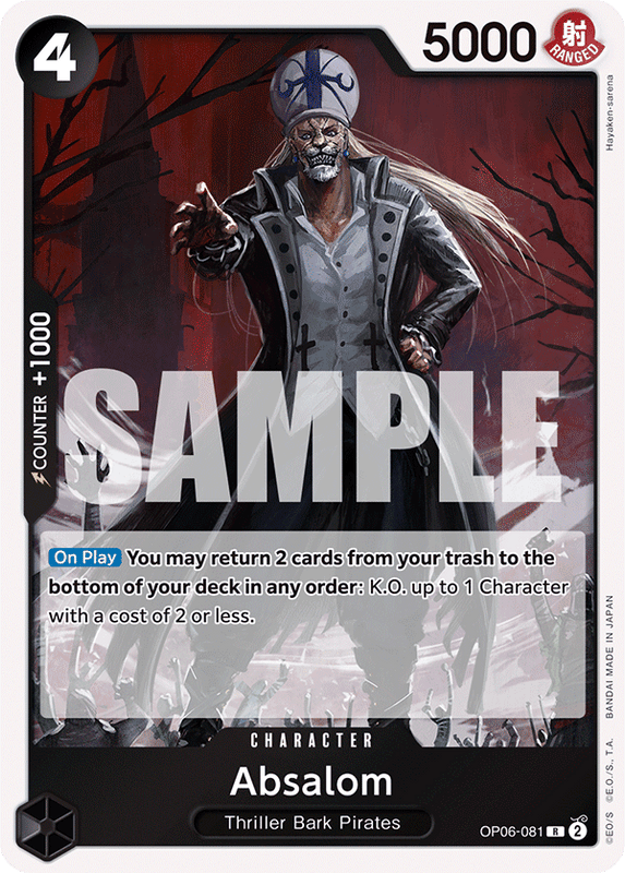 [On Play] Puedes devolver 2 cartas de tu basura al fondo de tu mazo en cualquier orden: K.O. hasta 1 personaje con un costo de 2 o menos. ULZ 000104 [On Play]/[En K.O.] Si tu Líder tiene el tipo {Thriller Bark Pirates}, saca 2 cartas y tira 2 cartas de tu mano.ULZ 000105 Este personaje no puede atacar.[ Activar: Main] Puedes K.O. 1 de tu tipo {Thriller Bark Pirates} Personajes: El efecto de este personaje se niega durante este turno.