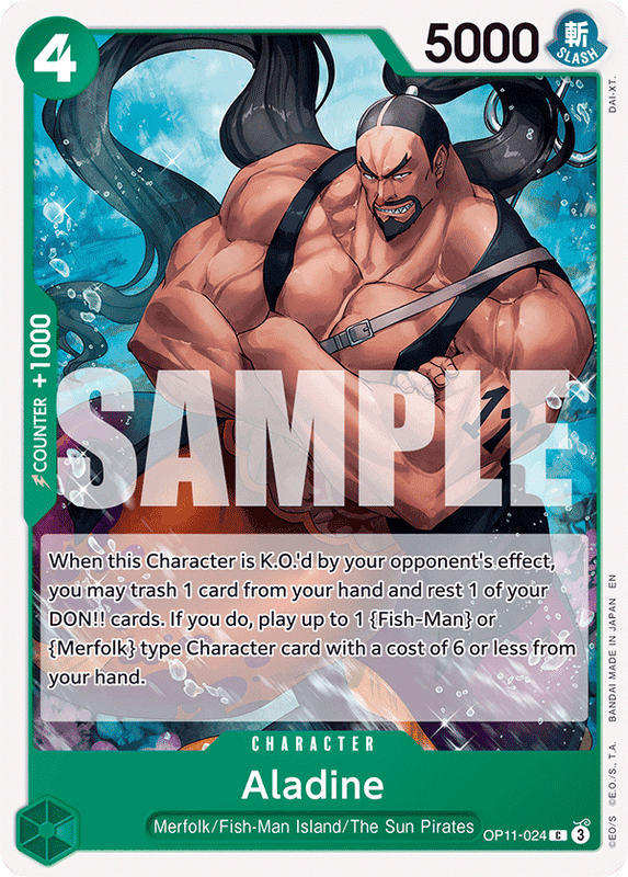 Cuando este personaje quede KO por el efecto de tu adversario, puedes descartar 1 carta de tu mano y dejar 1 de tus cartas de DON!!. Si lo haces, juega hasta 1 carta de personaje de tipo {Gyojin} o {Tritón} con un coste de 6 o menos de tu mano.