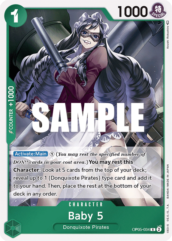 [Activar: Main] 1 (¡Puedes descansar el número especificado de DON! Cartas en su área de costos.) Puedes descansar este personaje: Mira 5 cartas desde la parte superior de tu baraja; revela hasta 1 carta de tipo {Donquixote Pirates} y añádela a tu mano. Luego, coloca tDescansa en la parte inferior de tu cubierta en cualquier orden.