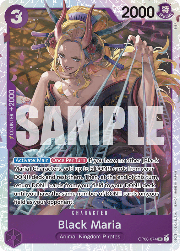 [Activar: Main] [Una vez por turno] Si no tienes otros personajes [Black Maria], ¡suma hasta 5 DON! ¡¡Cartas de tu DON!! Deck y Restearlos. Luego, al final de este turno, ¡devuelve DON! ¡¡Cartas de tu campo a tu DON!! ¡Mazo hasta que tengas el mismo número de DON!! Cartas en tu campo como tu oponente.