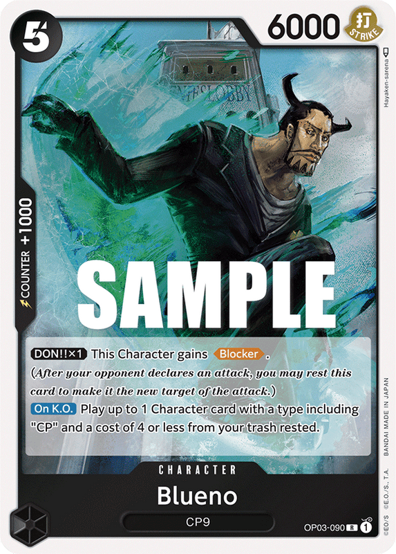 [¡¡DON!! X1] Este personaje gana [Blocker].( Después de que tu oponente declare un ataque, puedesDescansa esta carta para convertirla en el nuevo objetivo del ataque.)[ En K.O.] Juega hasta 1 carta de personaje con un tipo que incluya "CP" y un costo de 4 o menos de tu basura descansada.