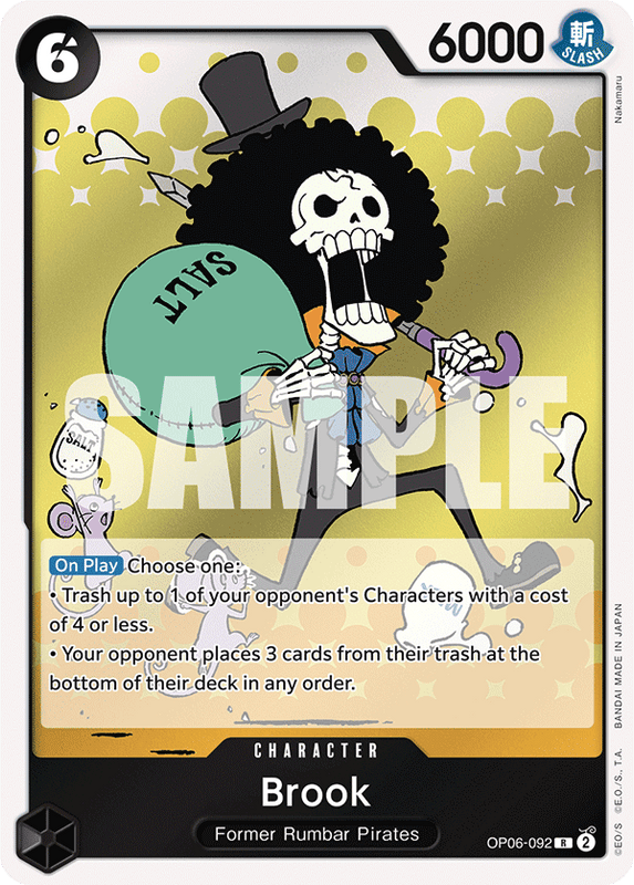 [On Play] Elige uno:• Destruye hasta 1 de los personajes de tu oponente con un costo de 4 o menos. • Tu oponente coloca 3 cartas de su basura en la parte inferior de su mazo en cualquier orden.