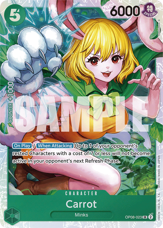 [On Play]/[Al atacar] Hasta 1 de tusLos personajes Resteados del oponente con un costo de 7 o menos no se activarán en la próxima fase de actualización de su oponente.