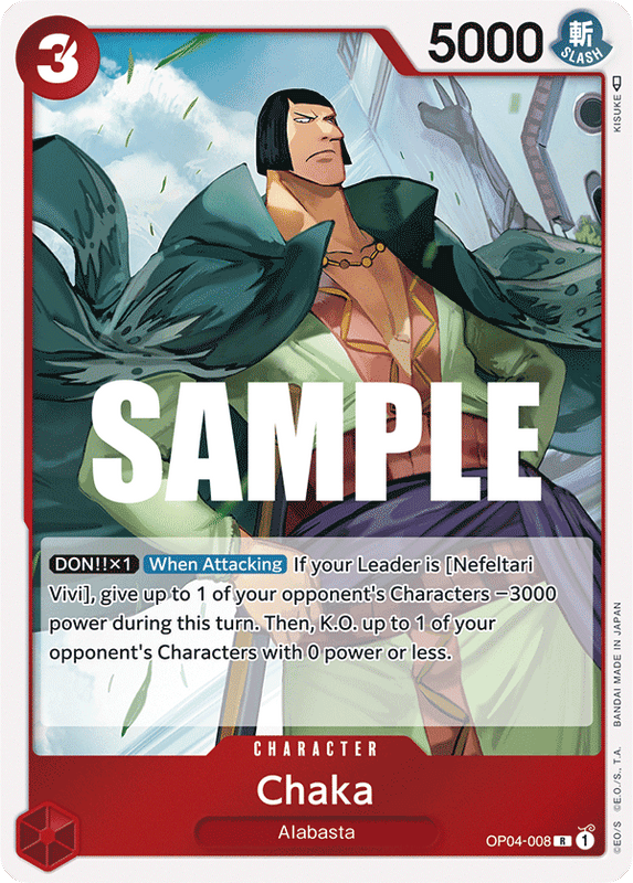 [¡¡DON!!X1] [Al atacar] Si tu líder es [Nefeltari Vivi], da hasta 1 de los personajes de tu oponente -3000 poder durante este turno. Luego, noquea hasta 1 de los personajes de tu oponente con 0 poder o menos.
