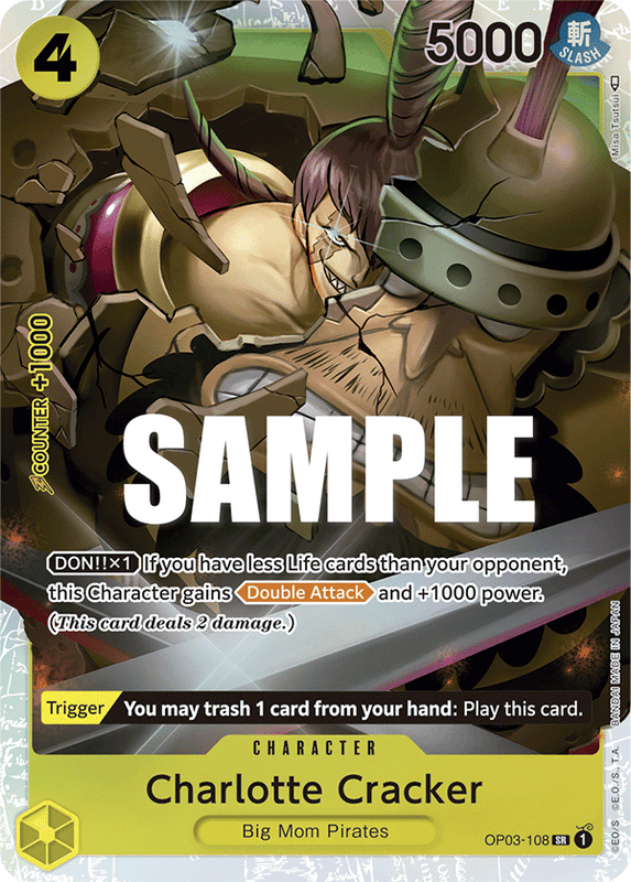 [DON!! x1] If you have less Life cards than your opponent, this Character gains [Double Attack] and +1000 power.(This card deals 2 damage.) [Trigger] Puedes tirar 1 carta de tu mano: Juega esta carta.