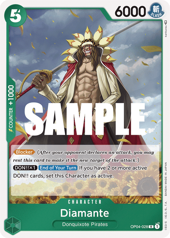 [Blocker] (Después de que tu oponente declare un ataque, puedes dejar esta carta para que sea el nuevo objetivo del ataque.)[ ¡¡DON!! X1] [Fin de tu turno] Si tienes 2 o más activos, ¡DON! Cartas, establece este personaje como activo.