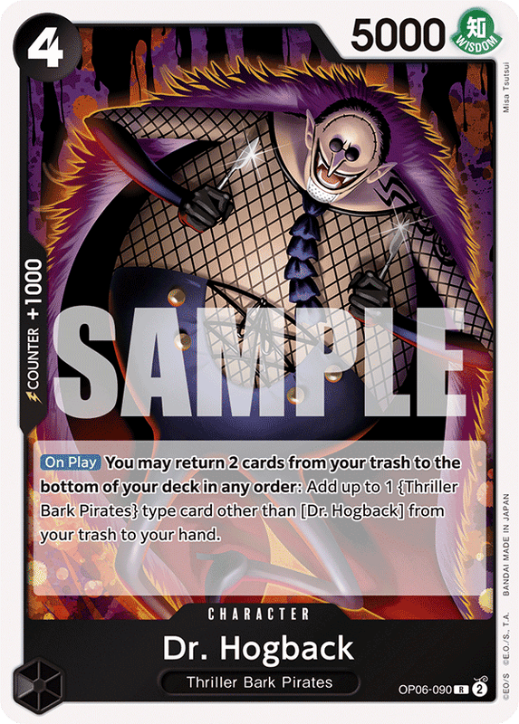 [On Play] PuedesDevuelve 2 cartas de tu basura al fondo de tu baraja en cualquier orden: Añade hasta 1 carta tipo {Thriller Bark Pirates} que no sea [Dr. Hogback] de tu basura a tu mano.