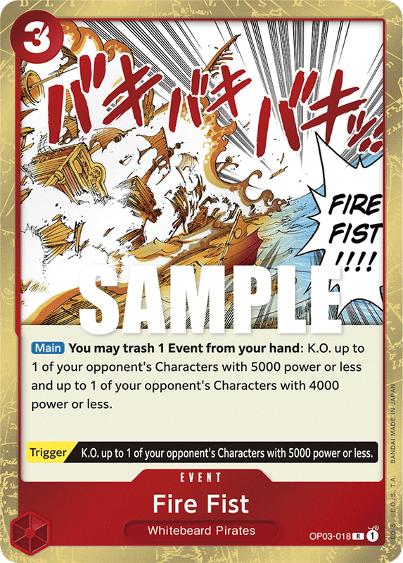 [Main] Puedes destruir 1 Evento de tu mano: K.O. hasta 1 de los personajes de tu oponente con 5000 de poder o menos y hasta 1 de los personajes de tu oponente con 4000 de poder o menos. [Trigger] K.O. hasta 1 de los personajes de tu oponente con 5000 de poder o menos.