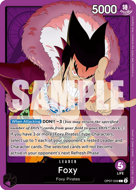 [Al atacar] ¡¡DON!! ?3 (¡Puede devolver el número especificado de DON!! ¡¡Cartas de tu campo a tu DON!! Mazo.): Si tienes 3 o más personajes de tipo {Foxy Pirates}, selecciona el líder Restealodo de tu oponente y hasta 1 carta de personaje. Las cartas seleccionadas no se activarán en la siguiente fase de actualización de tu oponente.