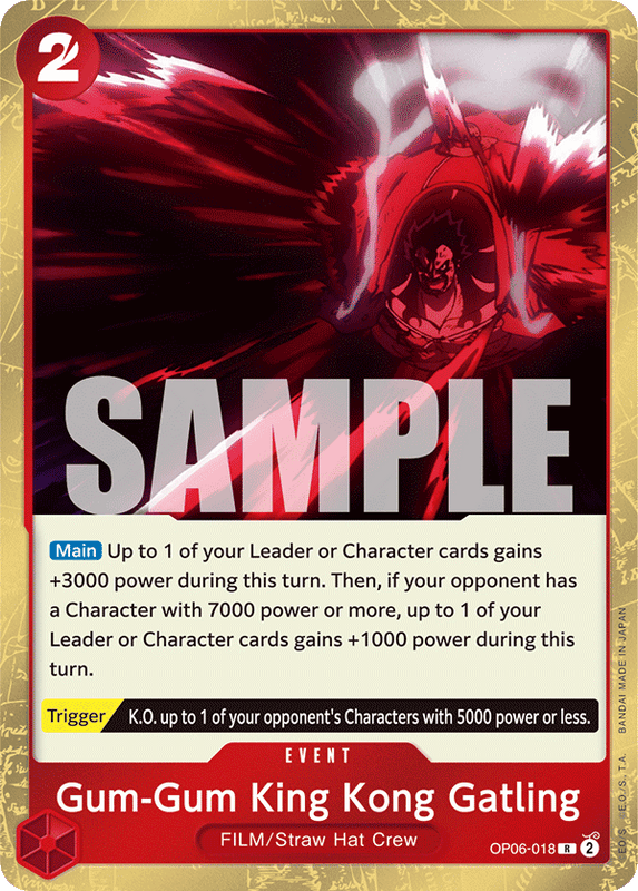[Main] Hasta 1 de tus cartas de líder o personaje gana +3000 de poder durante este turno. Entonces, si tu oponente tiene un personaje con 7000 de poder o más, hasta 1 de tus cartas de líder o personaje gana +1000 de poder durante este turno. [Trigger] K.O. hasta 1 de los personajes de tu oponente con 5000 de poder o menos.