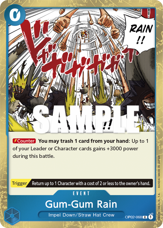 [Contador] Puedes tirar 1 tarjeta de tu mano: Arriba tO 1 de tus cartas de Líder o Personaje gana +3000 de poder durante esta batalla. .[Desencadenante] Devuelve hasta 1 personaje con un costo de 2 o menos a la mano del propietario.
