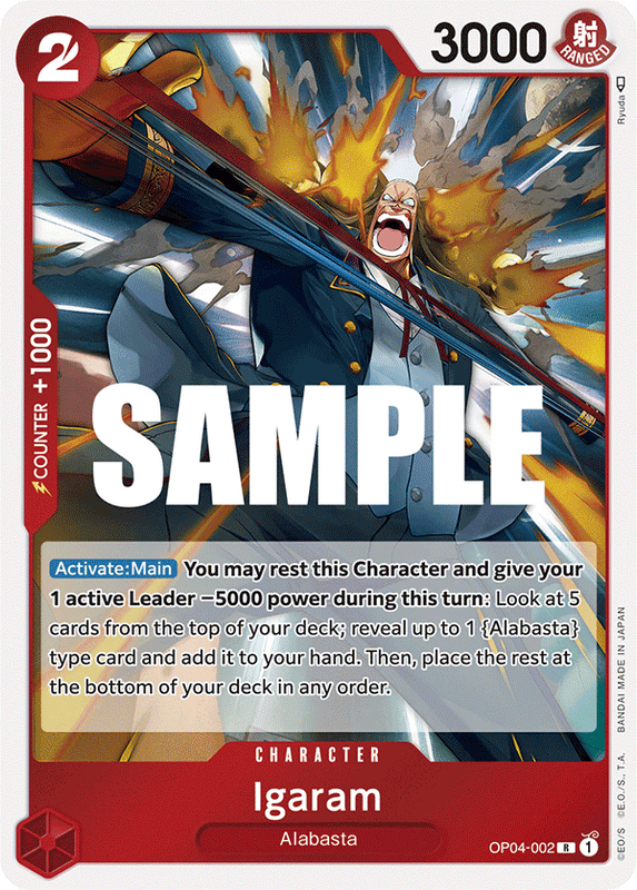[Activar: Main] Puedes descansar este personaje y darle a tu 1 líder activo -5000 de poder durante este turno: Mira5 cartas de la parte superior de tu baraja; revela hasta 1 carta de tipo {Alabasta} y añádela a tu mano. Luego, coloque el resto en la parte inferior de su cubierta en cualquier orden.