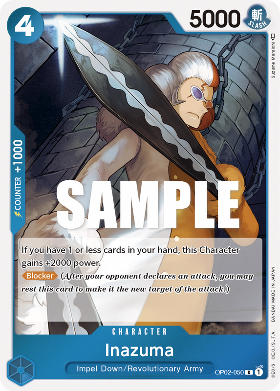Si tienes 1 o menos cartas en tu mano, este personaje gana +2000 de poder.[ Bloqueador] (Después de que tu oponente declareUn ataque, puedes descansar esta carta para convertirla en el nuevo objetivo del ataque.)