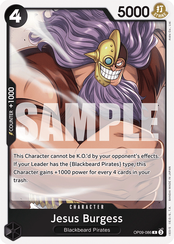 Este personaje no puede ser noqueado por los efectos de tu oponente. Si tu líder tiene el tipo {Piratas de Barbanegra}, este personaje gana +1000 de poder por cada 4 cartas en tu basura.