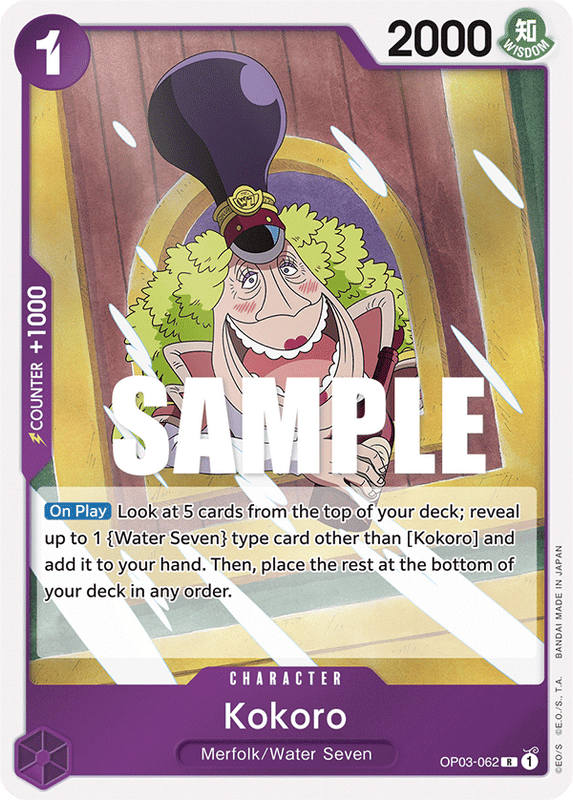 [On Play] Mira 5 cartas desde la parte superior de tu mazo; revela hasta 1 carta de tipo {Water Seven} que no sea [Kokoro] y añádela a tu mano. Luego, coloque el resT en la parte inferior de tu mazo en cualquier orden.