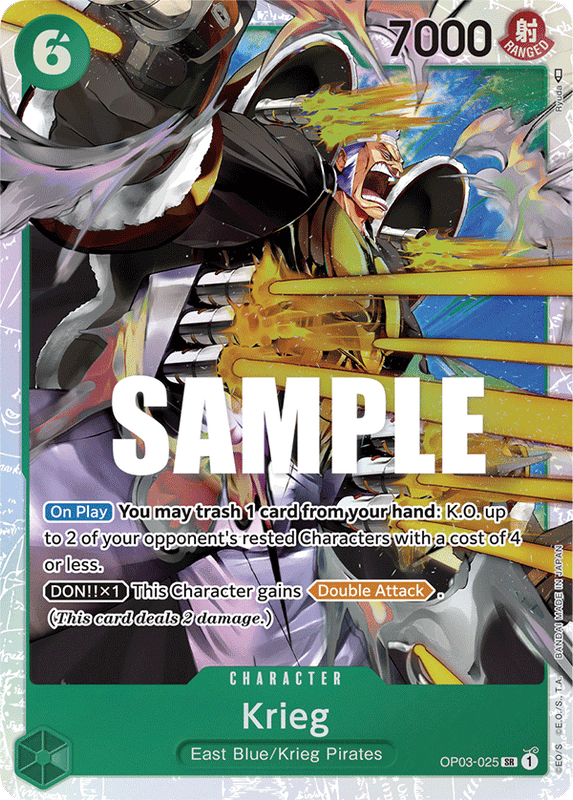 [On Play] Tú mAy tira 1 carta de tu mano: K.O. hasta 2 de los personajes descansados de tu oponente con un costo de 4 o menos.[ ¡¡DON!! X1] Este personaje gana [Doble ataque].( Esta tarjeta inflige 2 daños.)