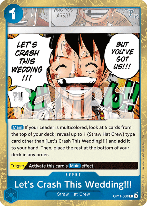 [Main] Si tu Líder es multicolor, mira 5 cartas del tope de tu mazo; revela hasta 1 carta de tipo {Tripulación del Sombrero de Paja} que no sea [¡Vamos a Colarse en la Boda!] y añádela a tu mano. Luego, coloca el resto en el tope de tu mazo en cualquier orden. [Trigger] Activa el efecto [Main] de esta carta.