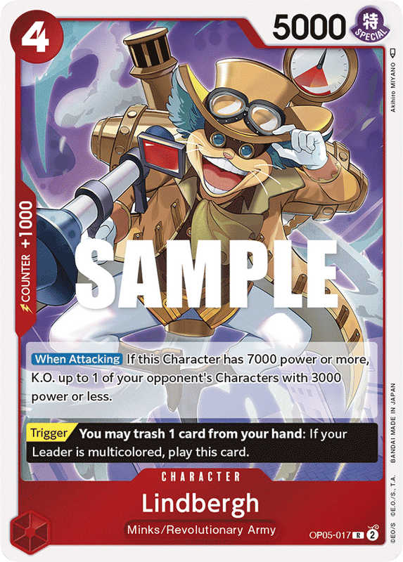 [Al atacar] Si este personaje tiene 7000 de poder o más, noquea hasta 1 de los personajes de tu oponente con 3000 de poder o menos. [Trigger] Puedes descartar 1 carta de tu mano: Si tu líder es multicolor, juega esta carta.