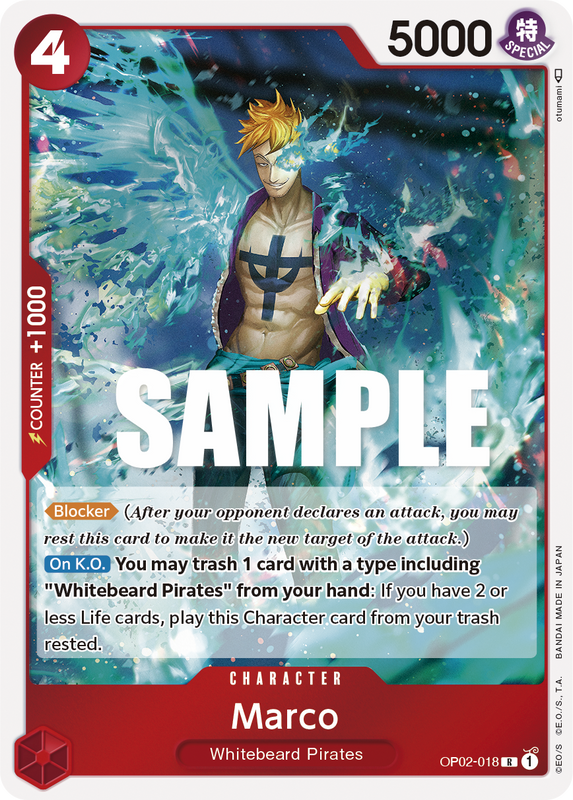 [BloquearR] (Después de que tu oponente declare un ataque, puedes descansar esta carta para que sea el nuevo objetivo del ataque.)[ En K.O.] Puedes tirar 1 carta con un tipo que incluya "Piratas de Barba Blanca" de tu mano: Si tienes 2 o menos cartas de Vida, juega esta carta de personaje de tu basura descansada.