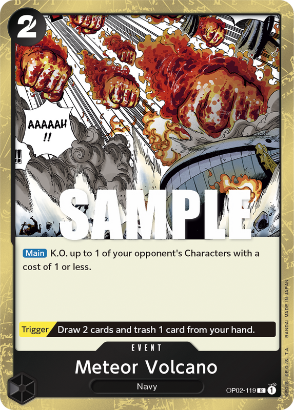 [Principal] K.O. hasta 1 de los personajes de tu oponente con un costo de 1 o menos. [Disparador] Saca 2 cartas y tira 1 carta de tu mano.