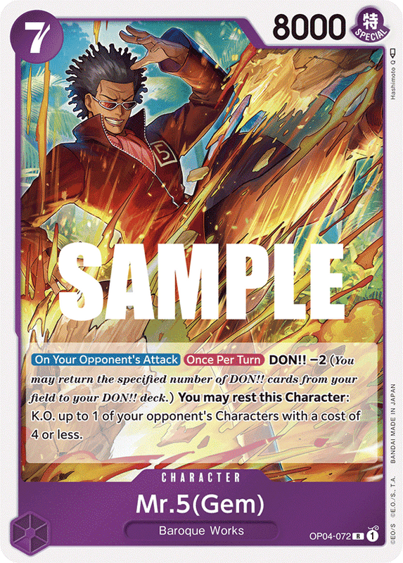 [En El Ataque De Tu Oponente] [Una Vez Por Turno] ¡¡DON!! ?2 (¡Puede devolver el número especificado de DON! ¡¡Cartas de tu campo a tu DON!! Cubierta.) Puedes descansar este personaje: K.O. hasta 1 de los personajes de tu oponente con un costo de 4 o menos.
