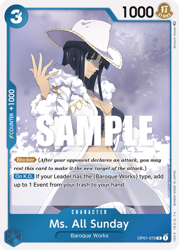 [Bloqueador] (Después de que tu oponente declare un ataque, puedes descansar esta carta para convertirla en el nuevo objetivo del ataque.)[Al K.O.] Si tu Líder tiene el tipo {Baroque Works}, agrega hasta 1 Evento de tu cementerio a tu mano.