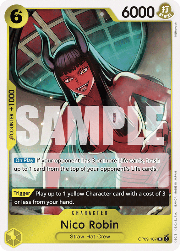[On Play] Si tu oponente tiene 3 o más vida caRds, tira hasta 1 carta de la parte superior de las cartas de vida de tu oponente. [Trigger] Juega hasta 1 carta de personaje amarilla con un costo de 3 o menos de tu mano.