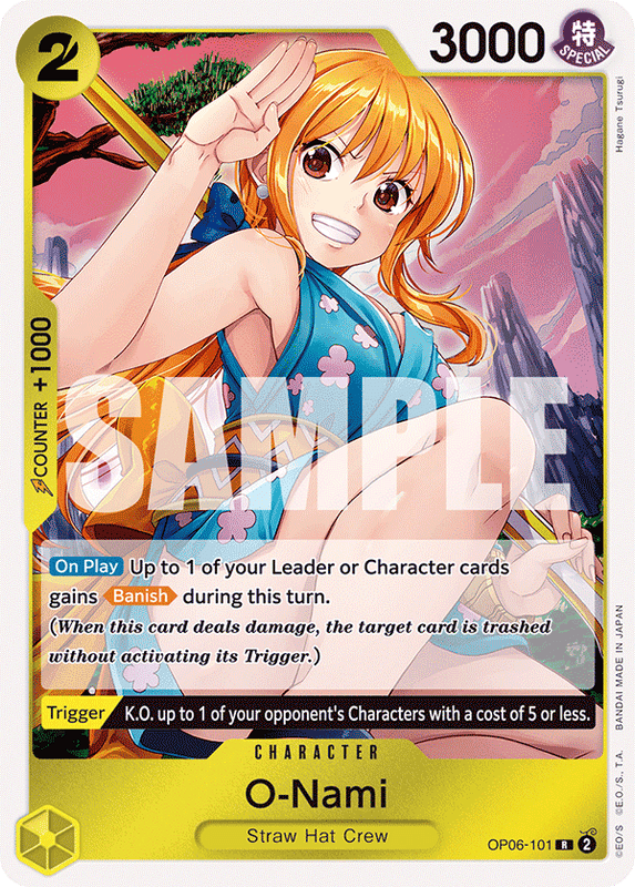 [On Play] Hasta 1 de tus cartas de Líder o Personaje gana [Desterrar] durante este turno.( Cuando esta carta inflige daño, la tarjeta objetivo se destruye sin activar su disparador.) [Trigger] K.O. hasta 1 de los personajes de tu oponente con un costo de 5 o menos.