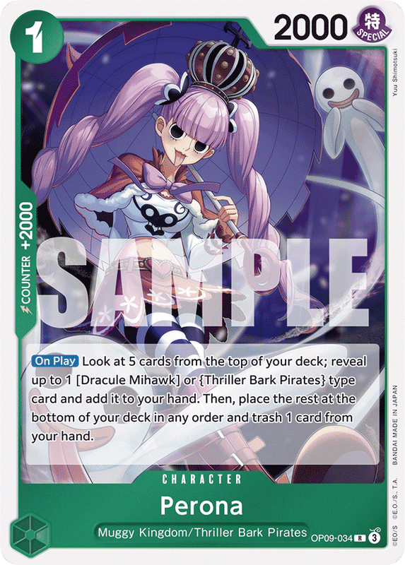 [On Play] Mira 5 cartas desde la parte superior de tu mazo; reveAl hasta 1 [Dracule Mihawk] o {Thriller Bark Pirates} escribe carta y añádela a tu mano. Luego, coloque el resto en la parte inferior de su baraja en cualquier orden y tire 1 carta de su mano.
