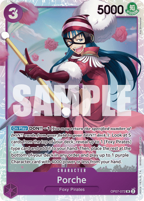 [On Play] ¡¡DON!! ?1 (¡Puede devolver el número especificado de DON!! ¡¡Cartas de tu campo a tu DON!! Baraja.): Mira 5 cartas desde la parte superior de tu mazo; revela hasta 1 carta tipo {Foxy Pirates} y añádela a tu mano. Luego, coloca el resto en la parte inferior de tu baraja en cualquier orden y juega hasta 1 carta de personaje púrpura con4000 potencias o menos de tu mano.
