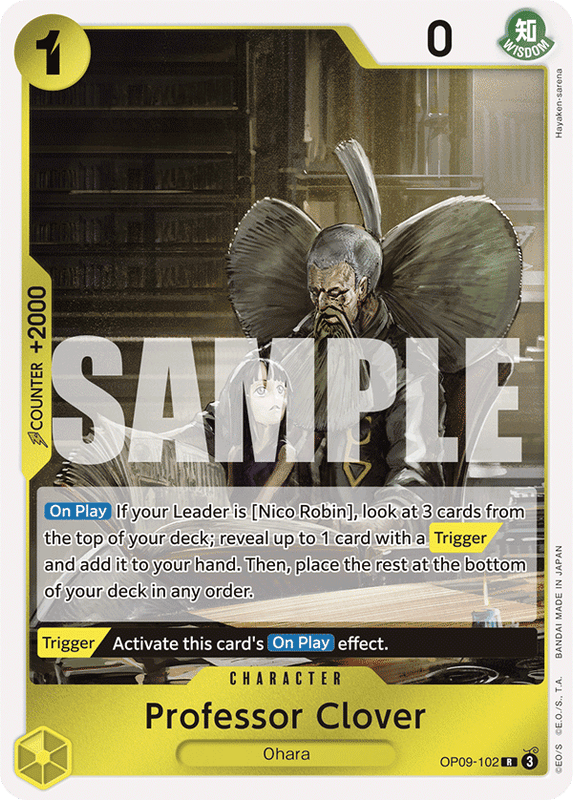 [On Play] Si tu líder es [Nico Robin], mira 3 cartas desde la parte superior de tu mazo; revela hasta 1 carta con un [Desencadenador] y añádela a tu mano.Luego, coloque el resto en la parte inferior de su cubierta en cualquier orden. [Trigger] Activa el efecto [On Play] de esta tarjeta.