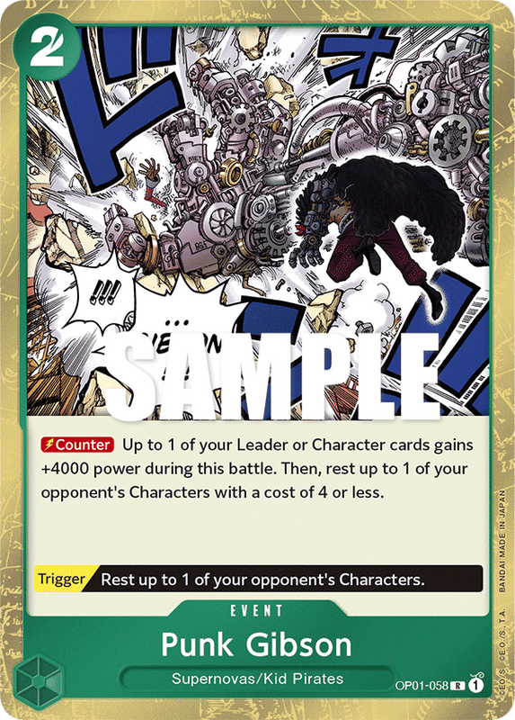 [Contraataque] Hasta 1 de tus cartas de Líder o Personaje gana +4000 de poder durante esta batalla. Luego, descansa hasta 1 de los Personajes de tu oponente con un costo de 4 o menos. [Trigger] Descansa hasta 1 de los Personajes de tu oponente.