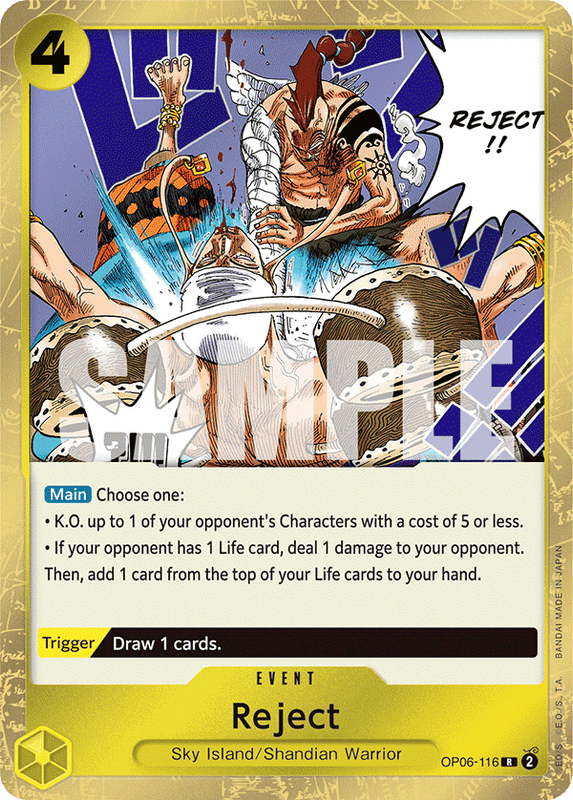[Main] Elige uno:• K.O. hasta 1 de los personajes de tu oponente con un costo de 5 o menos. • Si tu oponente hComo 1 carta de vida, inflige 1 daño a tu oponente. Luego, añade 1 carta de la parte superior de tus cartas de vida a tu mano. [Trigger] Saca 1 carta.