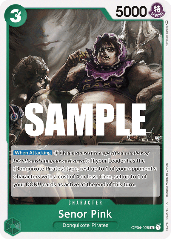 [WhEn Atacando] ? (¡Puedes descansar el número especificado de DON! Cartas en tu área de costo.): Si tu Líder tiene el tipo {Donquixote Pirates}, descansa hasta 1 de los personajes de tu oponente con un costo de 4 o menos. ¡¡Entonces, configura hasta 1 de tu DON!! Cartas como activas al final de este turno.