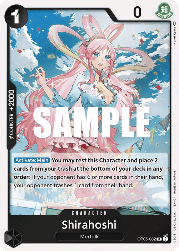 [Activate: Main] You may rest this Character and place 2 cards from your trash at the bottom of your deck in any order: If your opponent has 6 or more cards in their hand, your opponent trashes 1 card from their hand.