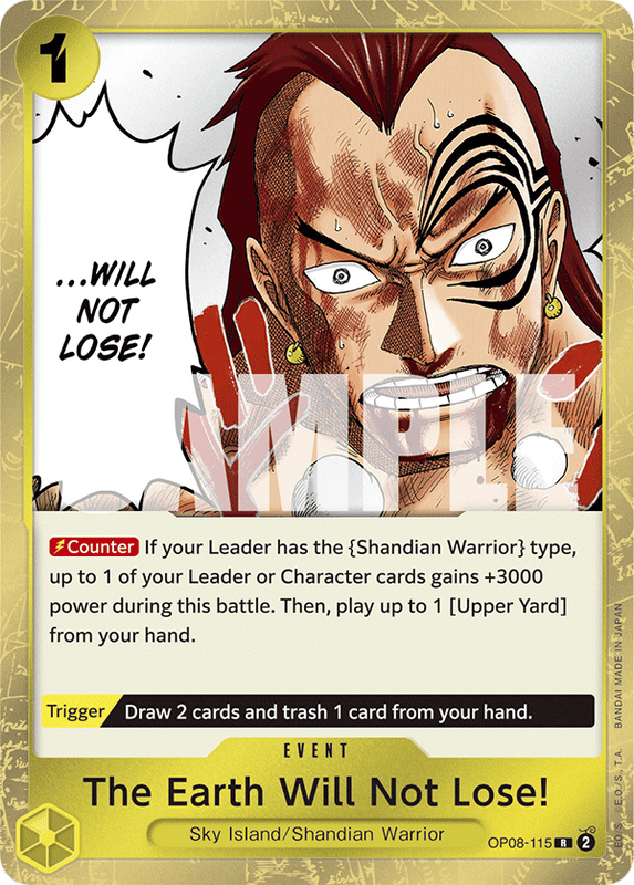 [Counter] Si tu Líder tiene el tipo {Shandian Warrior}, hasta 1 de tus cartas de Líder o Personaje gana +3000 de poder durante esta batalla. Luego, juega hasta 1 [Yarda superior] desde tu mano. [Trigger] Toma 2 cartas y tira 1 carta de tu mano.