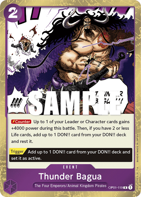 [Contraataque] Hasta 1 de tus cartas de Líder o Personaje gana +4000 de poder durante esta batalla. Luego, si tienes 2 o menos cartas de Vida, agrega hasta 1 carta DON!! de tu mazo DON!! y descansa. [Trigger] Agrega hasta 1 carta DON!! De tu mazo de DON!! Y activala.