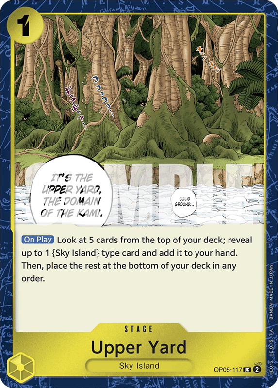 [On Play] Mira 5 cartas de la parte superior de tu mazo; revela hasta una carta de tipo {Isla del Cielo} y añádela a tu mano. Luego, coloca el resto en la parte inferior de tu mazo en cualquier orden.