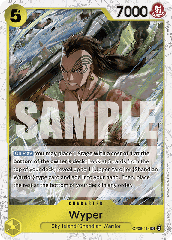[On Play] Puedes colocar 1 Escenario con un coste de 1 al final del mazo de su propietario: Mira 5 cartas del principio de tu mazo; revela hasta 1 carta de tipo [Upper Yard] o {Guerrero Shandian} y añádela a tu mano. Luego, coloca el resto al final de tu mazo en cualquier orden.