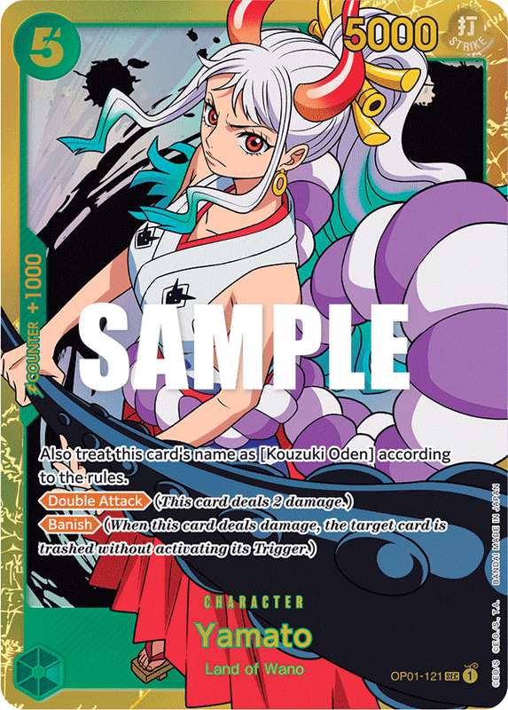 También trata el nombre de esta carta como [Kouzuki Oden] de acuerdo con las reglas.[Doble Ataque] (Esta carta inflige 2 daños.)[Banish] (Cuando esta carta inflige daño, la carta objetivo es descartada sin activar su Trigger.)