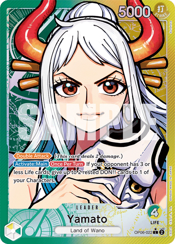 [Doble ataque] (Esta carta inflige 2 daños.)[ Activar: Main] [Una vez por turno] Si tu oponente tiene 3 o menos cartas de vida, ¡da hasta 2 DON Restealodos! Cartas para 1 de tus personajes.